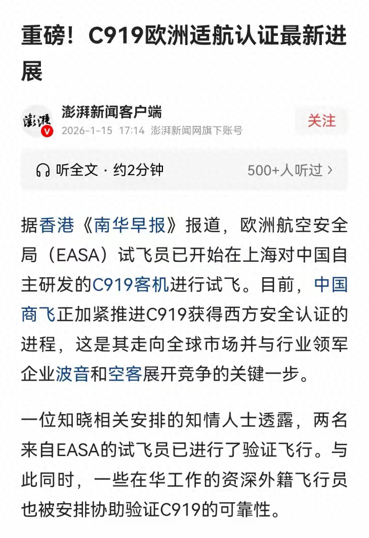 国产大飞机欧洲适航认证又进一步启盈策略,相信未来C919会像新能源汽车一样不断进步,相信时间会证明这一切。