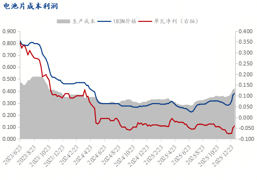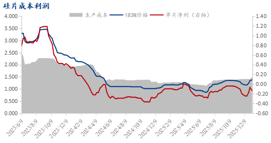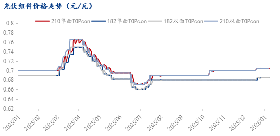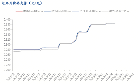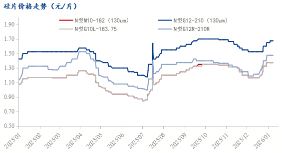 与此同时,硅片亦被纳入本次退税取消范围,成为上游首个受政策直接影响的环节,叠加自身供需格局失衡,近期硅片价格走弱。一方面,前期硅片企业大规模增产导致供大于求,即便2025年12月产量环比下降14.75%,行业整体开工率仍处于低位,但库存压力尚未完全缓解;另一方面,下游电池片企业虽有涨价动作,但实际采购以刚需为主,且电池片自身也面临终端需求疲软的制约,对硅片的采购量难以持续提升。同时,硅料价格走弱本为硅片企业提供了成本缓冲,但退税取消的成本冲击与下游采购的压价行为,让硅片企业只能选择降价让利。