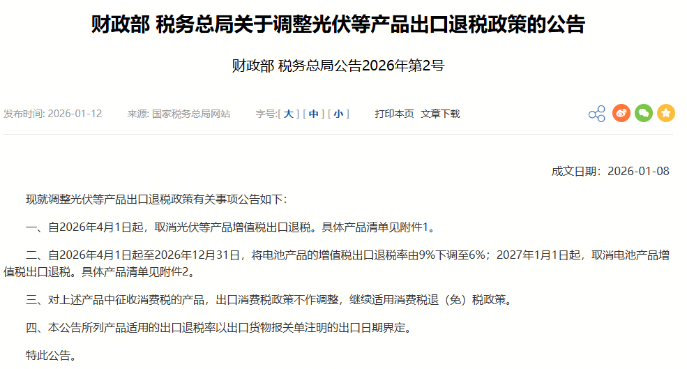 2026年1月9日,财政部、税务总局发布公告,明确自2026年4月1日起取消光伏硅片电池片组件等产品出口增值税退税。