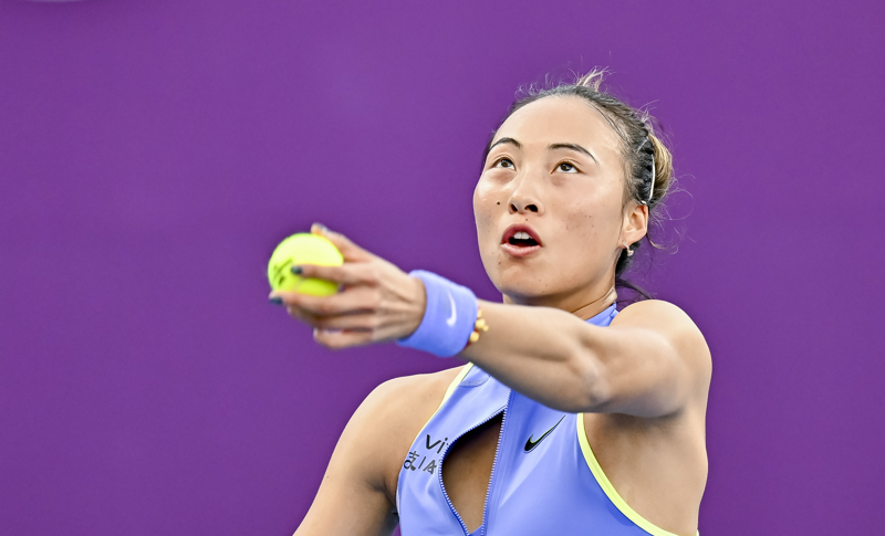 新华社照片,多哈,2026年2月10日\n 2月9日,郑钦文在比赛中发球。\n 当地时间2月9日,在WTA卡塔尔公开赛单打首轮比赛中,中国选手郑钦文2比1战胜美国选手肯宁,晋级第二轮。\n 新华社发(尼库摄)